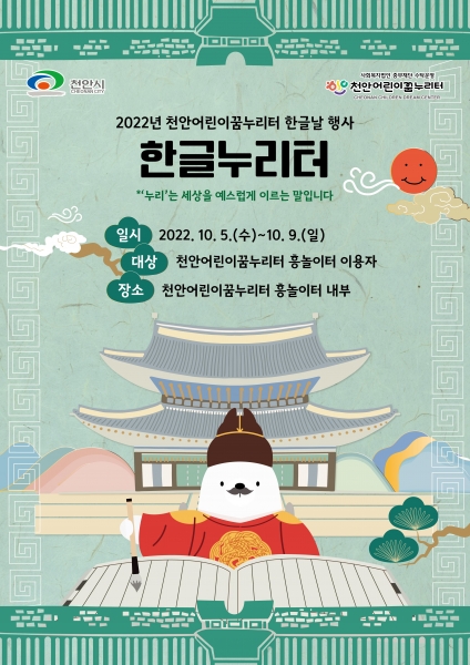 한글날 행사 ‘한글누리터’를 이용하기를 원하는 어린이는 기간 내에 천안어린이꿈누리터 흥놀이터 예약 후 방문하면 된다.