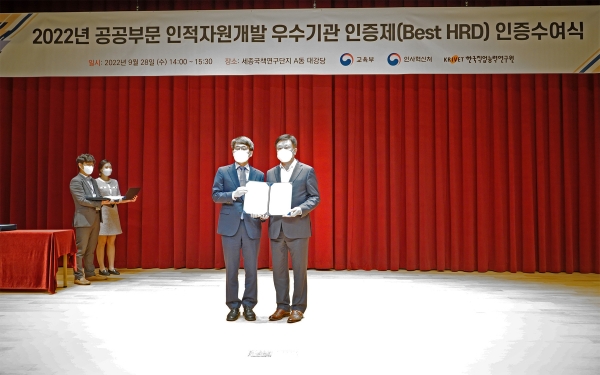 인적자원개발 우수기관은 능력 중심으로 인재를 채용 · 관리하고 재직자의 역량개발을 위해 지속적인 교육훈련 기회를 제공하는 등 인적자원개발이 우수한 기관에게 인증을 부여하는 제도이다.