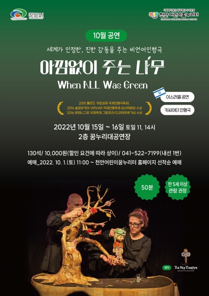 이스라엘 키씨어터 팀이 올해 처음으로 국내에서 진행하는 이번 공연은 모든 것을 줘도 아깝지 않은 나무와 소년의 은유된 사랑 이야기를 어린이 눈높이에 맞춰 말이 없이 인형으로 메시지를 전달한다.