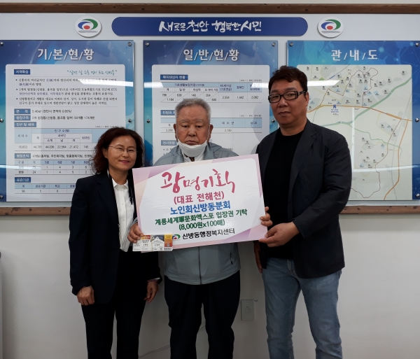 [세종타임즈] 광명기획은 지난 7일 천안시노인회 신방동분회에 계룡세계군문화엑스포 입장권 100매를 기부했다.