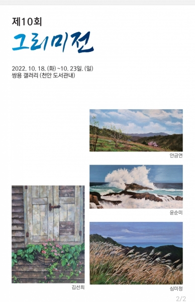 작품활동을 꾸준히 이어오고 있는 ‘그리미’ 동호회는 자연의 아름다움을 스케치하고 표현하는 단체로 이번 전시는 봄, 여름, 가을, 겨울 천안 주변의 아름다운 사계절 풍경을 스케치하고 넓은 캔버스에 표현한 회원들의 개성이 담긴 유화 작품들을 선보인다.