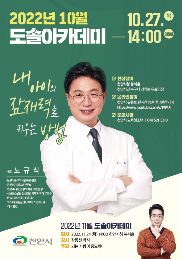 [세종타임즈] 천안시는 오는 27일 오후 2시 ‘내 아이의 잠재력을 키우는 방법’이라는 주제로 정신건강의학과 전문의 노규식 박사를 초청해 10월 도솔아카데미 강연을 진행한다.