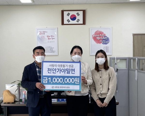 정원진 읍장은 “지역의 어려운 이웃을 위해 지속적으로 따뜻한 마음을 전해주시는 천안가야밀면에 감사드리며 기부해주신 소중한 성금은 꼭 필요한 곳에 쓰도록 하겠다”고 말했다.