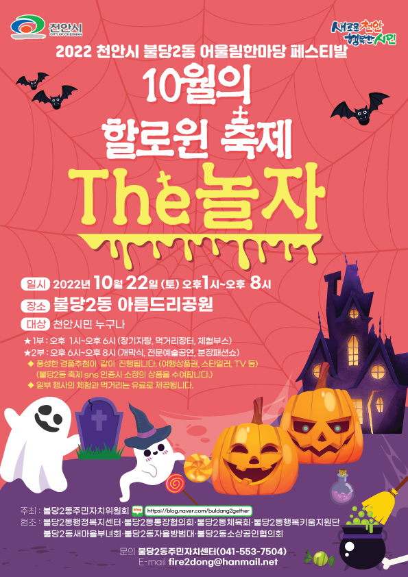 [세종타임즈] 오는 22일 천안시 불당동 아름드리공원에서 불당2동 어울림한마당 할로윈 테마 축제 ‘불무골 할로윈 축제 더놀자’가 열린다.