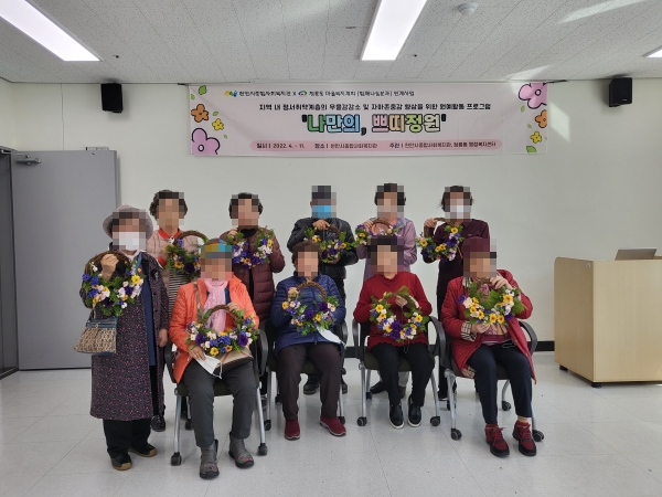 이번 하반기 사업은 독거노인을 대상으로 생화꽃바구니, 생화리스, 생화손목코사지 만들기 등 3회기 원예프로그램을 진행했다.