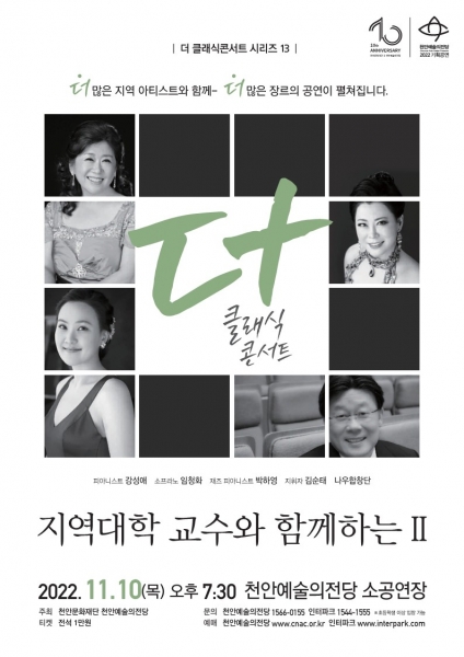 10일에는‘ 더 클래식 콘서트 시리즈 13 - 지역대학교수와 함께하는 Ⅱ’이 열려 천안지역 문화예술 발전과 전문 인재 양성을 위한 교수들이 피아노, 성악, 재즈 피아노, 합창 등을 선보인다.