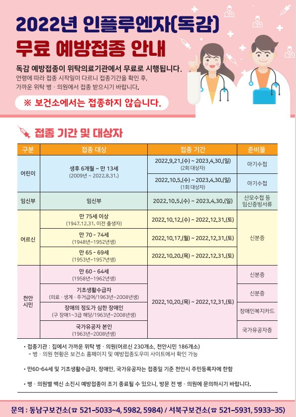 예방접종은 가까운 동네 위탁 병의원에서 가능하며 병의원 현황은 예방접종도우미 누리집 ‘의료기관 찾기’ 또는 서북구·동남구보건소 누리집에서 확인할 수 있다.