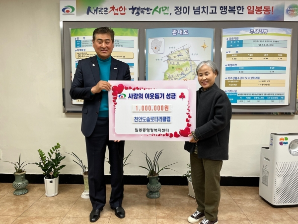 [세종타임즈] 국제로타리 3620지구 천안도솔로타리클럽가 지난 14일 이웃돕기 성금 100만원을 천안시 일봉동에 후원했다고 밝혔다.