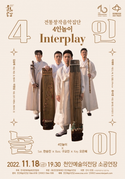[세종타임즈] 천안문화재단이 18일 천안예술의전당 소공연장에서 전통창작음악집단 4인놀이 ‘Interplay’ 공연을 개최한다.