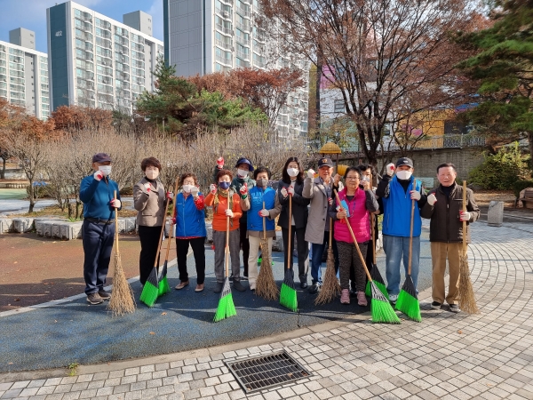 이날 쌍용3동 11개 경로당 회장과 회원들은 공원 및 길가에 쌓인 낙엽을 청소했다.