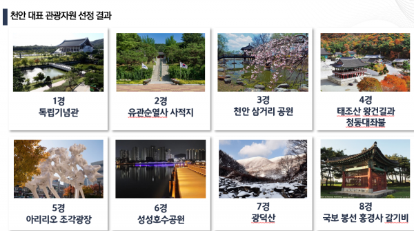 천안시는 천안 대표 관광자원 재선정을 위해 실시한 시민과 관광객 대상 설문조사 결과를 토대로 선정위원회 최종 심의를 거쳐 ‘천안 8경’을 선정했다고 18일 밝혔다.