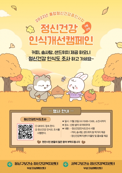 QR코드를 통해 천안시민 누구나 정신건강 인식도 조사를 시행할 수 있으며 시행 후 커피, 솜사탕, 샌드위치 등 다양한 먹거리를 즐길 수 있다.