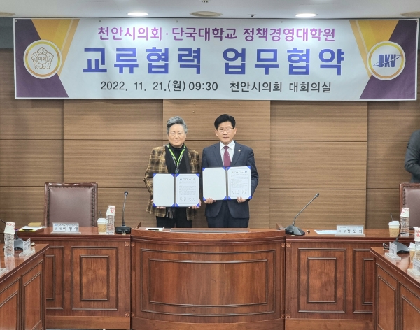 [세종타임즈] 천안시의회는 11월 21일 천안시의회 대회의실에서 단국대학교 정책경영대학원과 상호발전과 연구개발, 인적교류 등을 위한 업무협약을 체결했다.