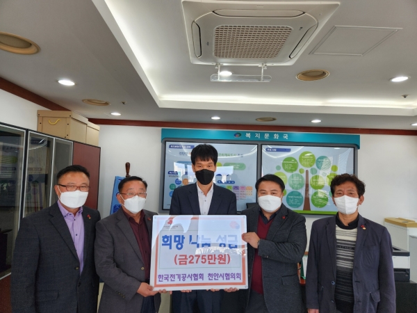 희망나눔 성금 전달식에는 한국전기공사협회 천안시협의회 박종수 회장, 김기철 사무총장, 황종선 재무국장, 곽영도 상생위원장이 참석했다.