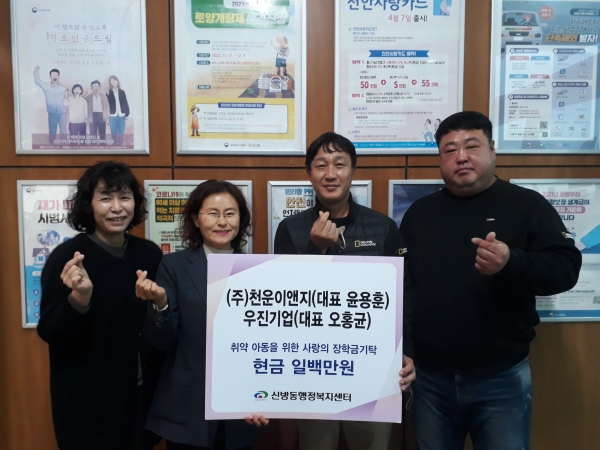 [세종타임즈] ㈜천운이앤지·우진기업이 지난달 30일 취약아동을 위한 장학금 100만원을 천안시 신방동에 기탁했다.