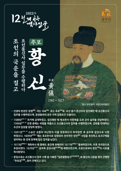 [세종타임즈] 공주시는 조선중기 문신이자 임진왜란 때 조선의 국운을 걸고 조선통신사 임무를 수행한 창원황씨 공주 지역 입향조 인물인 추포 황신 선생을 12월의 역사 인물로 선정했다고 1일 밝혔다.