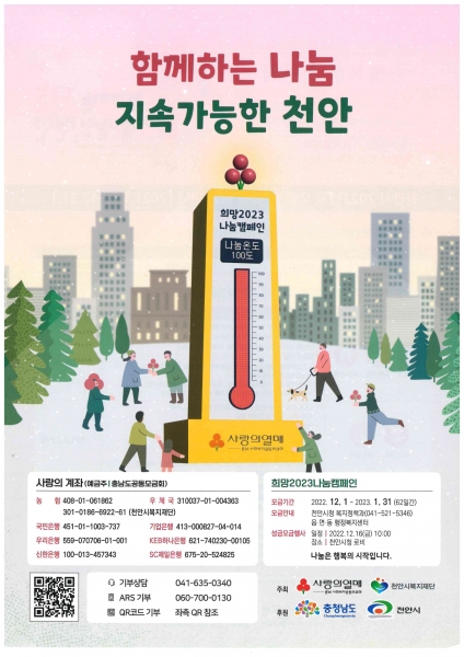 [세종타임즈] 천안시가 ‘함께하는 나눔, 지속 가능한 천안’이라는 슬로건과 함께 내년 1월 31일까지 62일간의 나눔 대장정에 돌입했다.