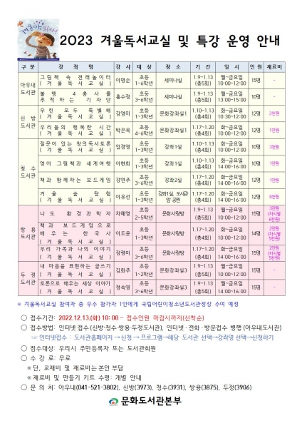 도서관 관계자는 “우리 친구들이 겨울방학 동안 독서의 즐거움을 알고 창의·사고력을 높일 수 있는 체험의 기회가 되길 바란다”고 전했다.
