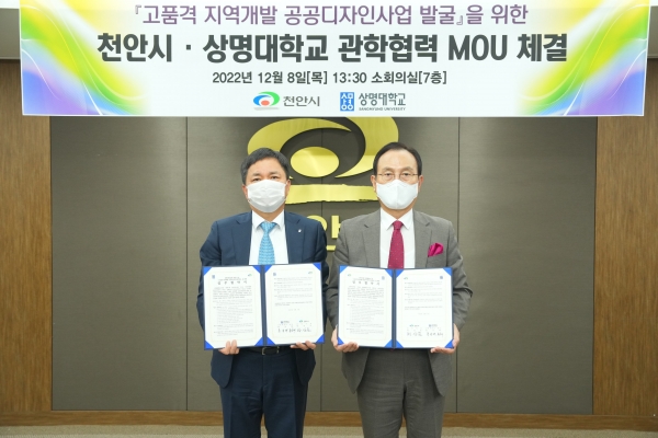 [세종타임즈] 천안시는 상명대학교와 지난 8일 시청 7층 소회의실에서 ‘고품격 지역개발 공공디자인사업’ 발굴을 위한 관학 협력 업무협약을 체결했다.