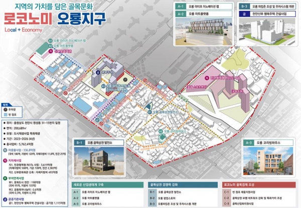 오룡지구 도시재생사업은 ‘지역의 가치를 담은 골목문화 로코노미 오룡지구’라는 주제로 라이프스타일·문화·예술 기반의 새로운 산업생태계를 구축해 공공기관 이전으로 쇠퇴하고 있는 신부동 옛 법원거리 주변의 골목경제를 활성화한다.