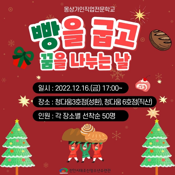 [세종타임즈] 천안시태조산청소년수련관이 16일 청소년의 건강한 성장을 위해 ‘빵을 굽고 꿈을 나누는 날’을 운영한다.