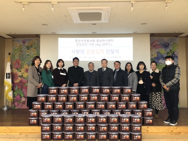 이날 전달된 김치는 충남하나센터가 좋은이웃 봉사회과 직산새마을하늘교회가 직접 만든 김치를 후원받아 이뤄졌다.