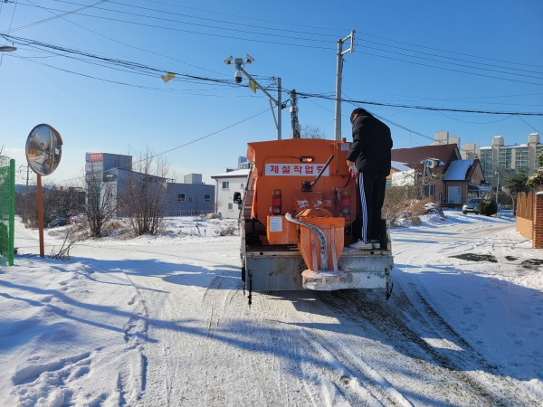 구역별로 읍내 외곽도로와 이면도로에는 제설차량을 운행해 염화칼슘 5톤 가량을 살포했고 인도·농어촌도로·소로 등을 위해서는 59개 마을 이장들에게 4톤의 염화칼슘을 사전 배부해 대응했다.
