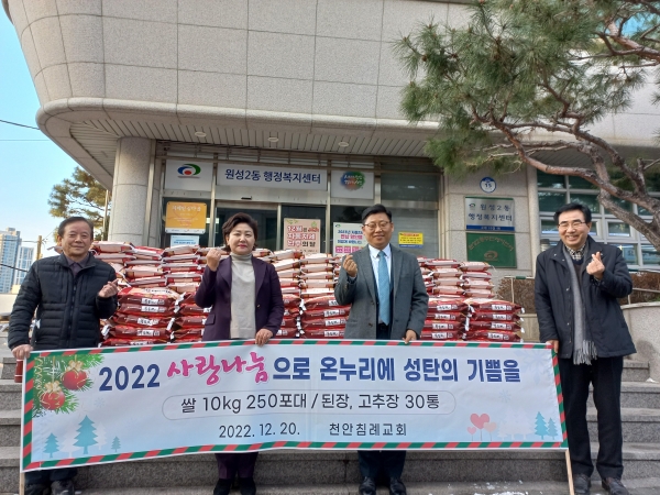 이날 천안침례교회는 쌀 10kg 250포대와 된장·고추장 30통을 후원했다.