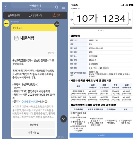 별도 신청 없이 카카오 알림톡, KT공공알림문자로 본인인증 및 동의를 거쳐 불법주정차 과태료 부과 내용을 확인할 수 있다.