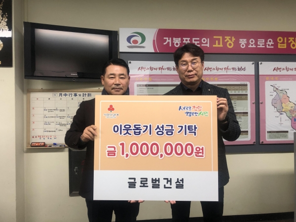 [세종타임즈] 글로벌건설이 지난달 30일 입장면 저소득 가정 대학생에게 전달해 달라며 100만원 장학금을 입장면에 기부했다.
