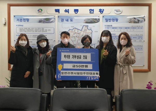 김수진 백석동장은 “정성 어린 성금을 준비해주신 백석호반리젠시빌아파트 입주민분들께 감사드리며 전해주신 기부금은 백석동 이웃을 살피고 돕는 데 사용하겠다”고 전했다.