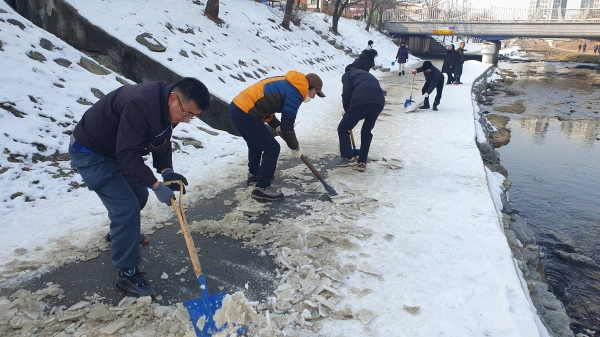 이들은 계속되는 한파로 원성천 산책로에 쌓인 눈이 얼어붙어 보행하기 어렵고 사고 발생 위험이 높아짐에 따라 빙판 제거 작업에 나섰다.