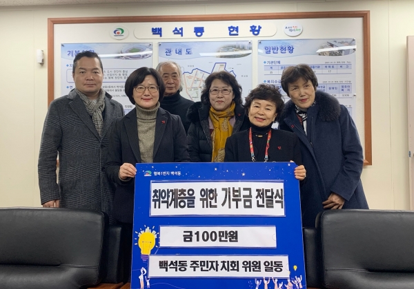 [세종타임즈] 천안시 백석동 주민자치회가 지난 16일 취약계층을 위한 후원금 100만원을 백석동에 기탁했다.
