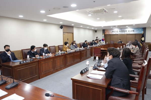 보고회는 의회사무국 총괄현황 보고 의원운영위, 경제산업위, 행정안전위, 복지문화위, 건설교통위, 의정팀, 의사팀, 홍보팀, 정책지원팀, 입법지원팀 순으로 진행됐으며 2023년 제9대 천안시의회의 방향성을 다시 확인하는 시간이었다.