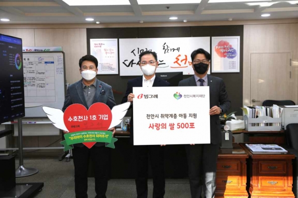 [세종타임즈] 주식회사 빙그레가 지난 18일 오후 천안시와 천안시복지재단이 함께 추진하는 ‘우리아이 수호천사 되어주기’ 캠페인에 동참하며 사랑의 쌀을 천안시에 전달했다.