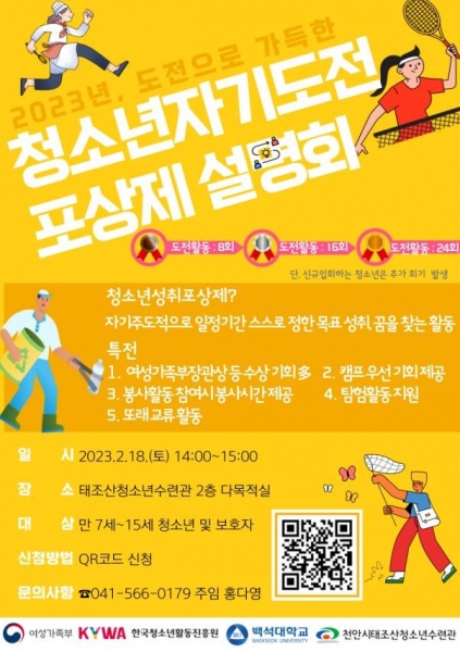 [세종타임즈] 천안시태조산청소년수련관은 2월 18일 수련관 다목적실에서 만 7세~15세 청소년과 보호자를 대상으로 ‘2023년 청소년성취포상제 설명회’를 개최한다.