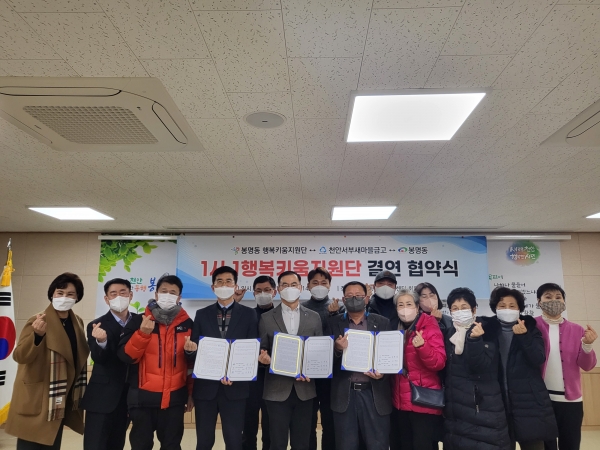 체결식에는 심영섭 봉명동 행복키움지원단장, 조한영 천안서부새마을금고 이사장, 박경화 봉명동장이 참석했다.