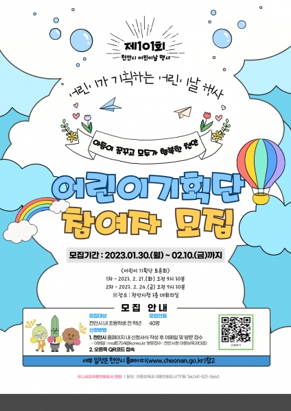 [세종타임즈] 천안시는 어린이가 기획하는 어린이날 행사 추진을 위해 2월 10일까지 ‘어린이 기획단’을 모집한다.