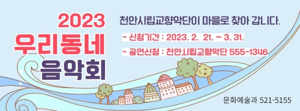 [세종타임즈] 천안시는 3월 31일까지 마을로 찾아가는 음악회, 2023년도 천안시립교향악단의 ‘우리동네 음악회’ 관람 신청을 받는다.
