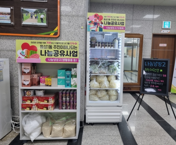 지난 9일 원성1동 나눔 냉장고는 개인이나 단체 등에서 후원한 식재료와 생필품 등으로 가득 찼다.