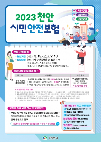 [세종타임즈] 천안시가 국내에서 일상생활 중 상해사고로 피해를 입은 시민에게 보험금을 지급하는 ‘2023년 시민안전보험’을 3월 15일부터 재가입해 운영에 들어간다.