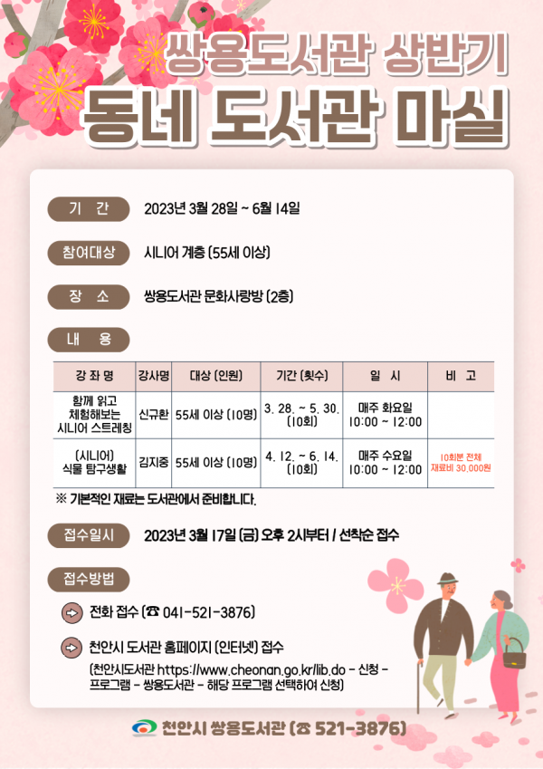 [세종타임즈] 천안시 쌍용도서관은 3월 말부터 55세 이상을 대상으로 상반기 ‘동네 도서관 마실’ 프로그램을 운영한다.