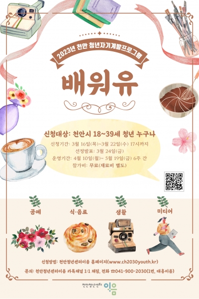 [세종타임즈] 천안시가 청년의 문화역량 향상과 진로탐색 기회 제공을 위한 청년자기계발프로그램인 ‘배워유’ 참여자를 모집한다고 20일 밝혔다.