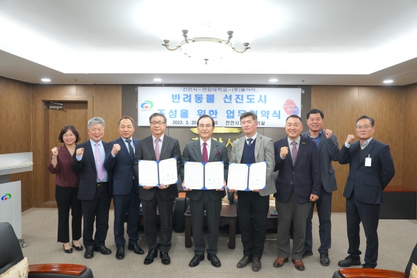 [세종타임즈] 천안시는 연암대학교, ㈜엘아이와 지난 20일 시청 소회의실에서 반려동물 선진도시 조성을 위한 업무협약을 체결했다고 밝혔다.
