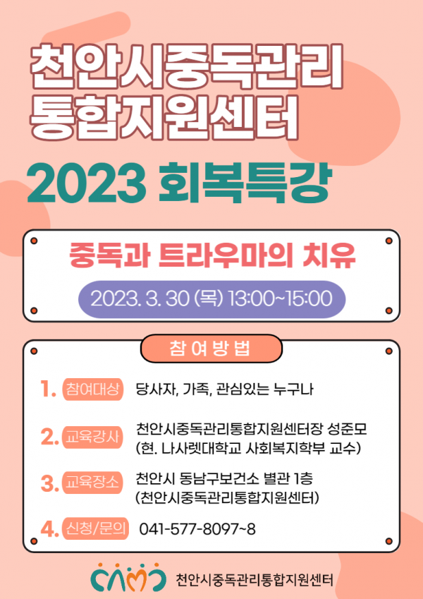 이번 강의는 중독 당사자와 가족뿐만 아니라 관심 있는 천안시민 누구나 참여할 수 있으며 중독으로 인한 트라우마와 이에 대한 대처 방법을 안내한다.