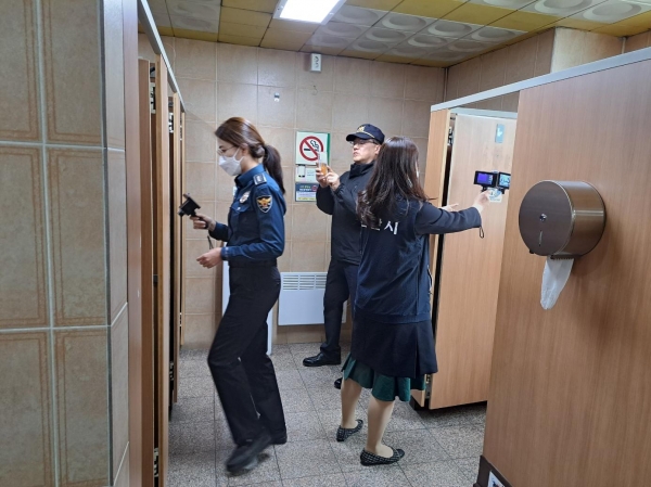 점검반은 열 감지, 적외선, 영상탐지가 가능한 종합형 불법 촬영 카메라 탐지 장비를 활용해 불법 촬영 의심 물체 여부, 시설흠집·파손 여부 등을 점검했으며 점검 완료 후에는 ‘불법 촬영 카메라 수시점검 화장실’ 홍보 스티커를 부착했다.