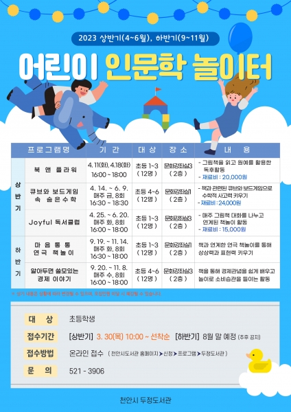 [세종타임즈] 천안시 두정도서관이 오는 4월부터 초등학생을 대상으로 ‘어린이 인문학 놀이터’ 프로그램을 운영한다.