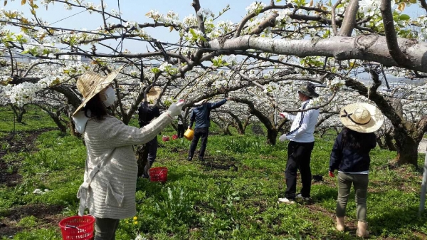 배꽃 인공수분은 매년 배꽃이 만개한 기간에만 가능한 작업으로 단기간 많은 일손이 필요함에 따라 인력지원이 필수이다.