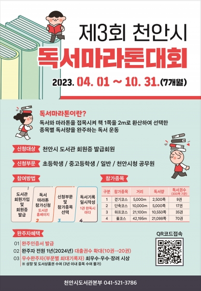 [세종타임즈] 천안시도서관본부는 시민의 건전한 독서문화 형성을 위해 오는 4월 1일부터 10월 31일까지 7개월간‘제3회 천안시 독서마라톤대회’를 운영한다고 밝혔다.