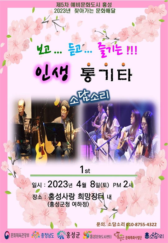 [세종타임즈] 홍성군 문화특화사업단‘2023년 찾아가는 문화배달’사업에 선정된 소담소리의‘보고 듣고 즐기는 인생 통기타’공연이 오는 4월 8일 오후 2시부터 홍성사랑 희망장터가 열리는 여하정 상설무대에서 개최된다.